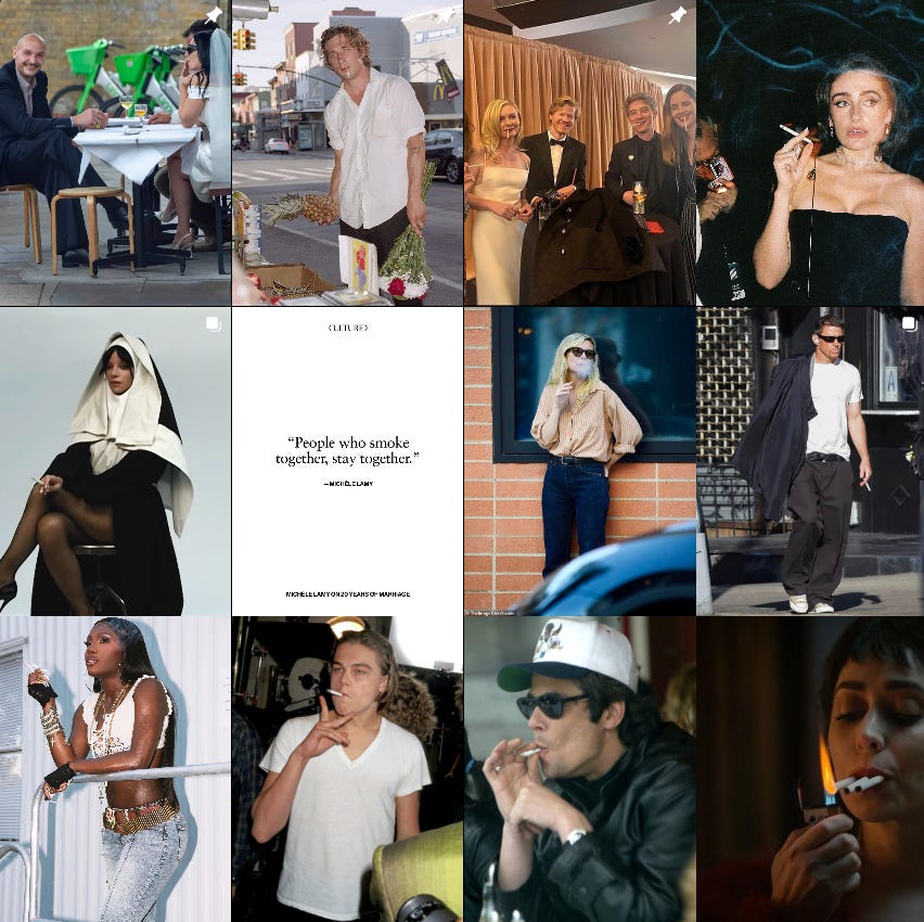 Four years ago, Canadian social media manager Jared Oviatt launched his “Cigfluencers” Instagram account. He told Bloomberg that a photo of Dua Lipa smoking inspired him to capture what he saw as quiet shift back to smoking in the West, particularly among young adults. Lately I’ve seen celebrities proudly lean into the cigarette aesthetic, and while smoking is much cooler than vaping and usage remain at all-time lows, it’s hard to say how this will pan out alongside a renewed obsession with thinness.