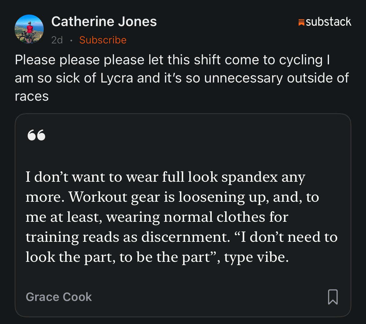 Two days ago, I saw this repost of Grace Cook’s call for more anti-workout workout gear. And today The Lycra Company filed for bankruptcy, which could suggest that workout wear is set to loosen up. Is Lululemon ready?