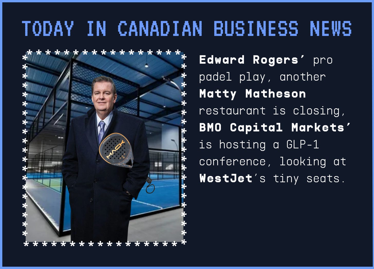 In today’s edition: Edward Rogers makes a play into pro padel, another Matty Matheson-backed restaurant closes, Shopify’s new perk for parents, BMO is hosting a GLP-1 conference, looking into WestJet’s very small seats, and more.